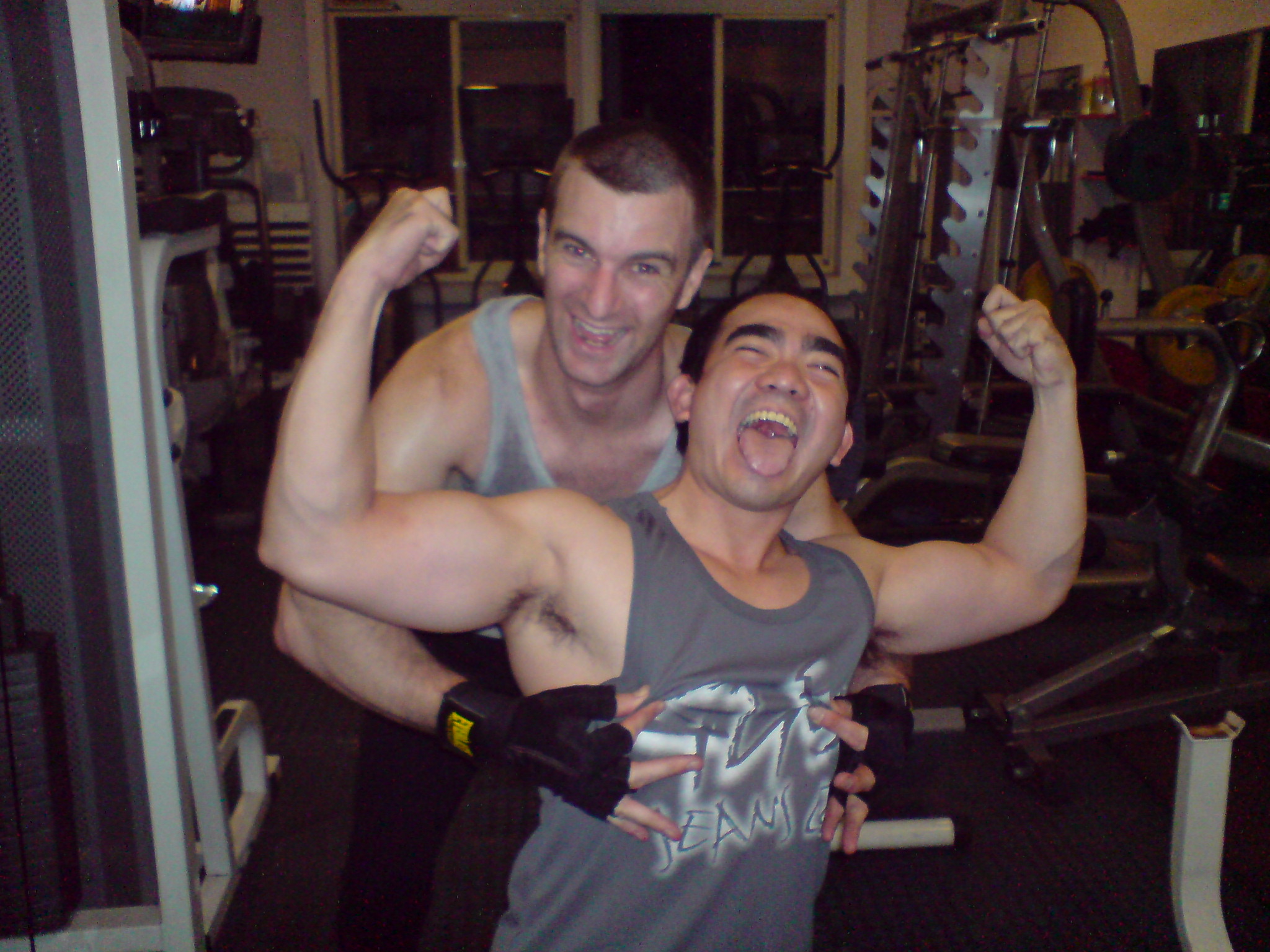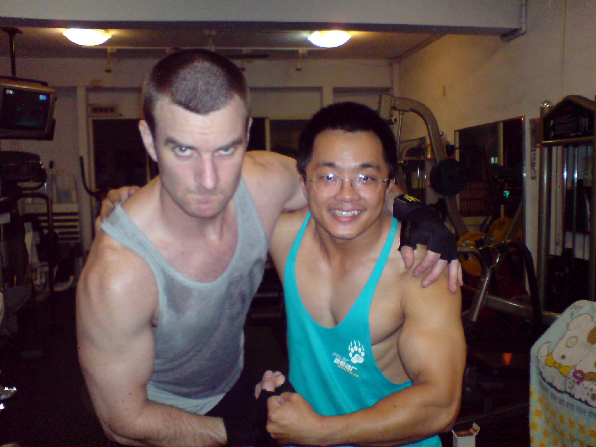 大家好!!我是翁仔~這幾張照片是本人與阿其以及其他成員在宜蘭羅東環球健身中心<兩個月一千元>拍的.目前成員加上我與阿其總共有8位..還有人陸續參加當中.這個團隊是三個月前我跟阿其討論之後所創的.最大的目的是要提倡大家多多運動.健身.健美.有氧....等等!老實說宜蘭人的運動人口真的是有限~以前在環球健身房有在做重訓沒幾個.千年兄.我.阿其.阿勝..沒幾個...其他人看到我們在這樣練就不太敢接近.在這當中我觀察很久.於是我就主動跟其他不認識的會員聊天..再聊的過程當中他們就跟我說其實他們是很嚮往我們這樣訓練的感覺.我那時二話不說就問.那你明天要不要跟我們一起練.他們猶豫了一下問~重量我們會跟不上耶.沒問題.一切從你們的重量開始.縱使你們不好意思跟我們練我也會教你們怎麼練.他們就非常高興的答應.重點就是我們目前不收費.明年有收也是一個月收200~300的.我跟阿其又經常找健身房裡面的人吃飯.所以目前環球健身房大家感情都不錯.練的時候還會互相虧~一下.哈!!我喜歡熱鬧的感覺~!!有時練完或上班時會繞到千年兄的店裡坐一下.跟大家推薦一下.千年兄的夢饗家鐵板燒真的很好吃.量又多!!極品阿!!