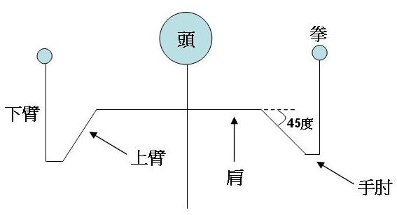 同時 不要使肩膀成完全張開之狀態 即上臂與身體的角度小於90度