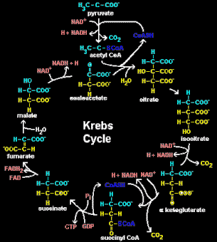 當由丙酮酸斷裂而生成的二碳乙醯輔酶A,與四碳的草醯乙酸結合時,克氏循環就開始了,八個反應逐一發生,當反應結束後,兩個碳釋出形成CO2;在一個偶合反應中生成一個ATP分子;並得到八個帶更高能量的電子且被NADH或其他載體運走;最後剩下和開始時一樣的四碳糖。