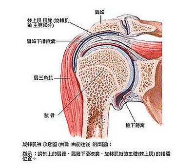 肌往上提,肩峰處硬拉到棘上肌,導致
