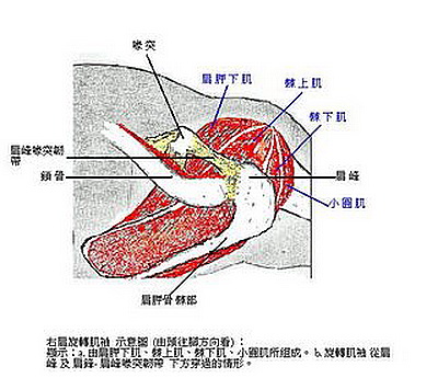 這些肌肉和肌腱幾乎將肩關節完全包住,使肱骨頭與肩胛關節盂的關節面可以穩定。