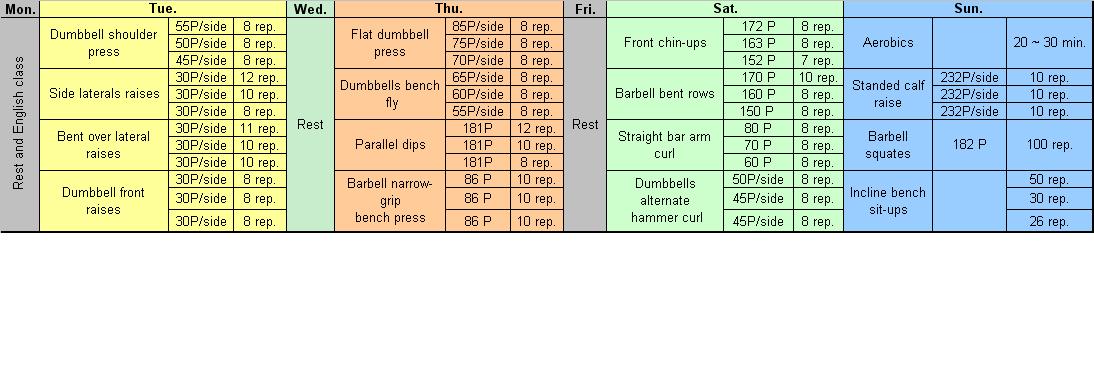 以我自己來說, 肩膀跟胸肌的訓練中間只隔一天會休息不夠.. 如果星期四練胸時三角肌不夠力的話可以把星期四跟六的訓練對調.