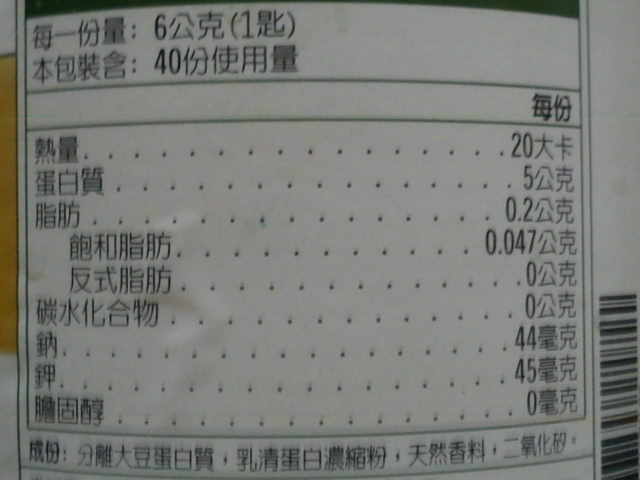 另看了你練完喝的東西,一般人體吸收蛋白質一次約25~30克,故你約一次補充5~6匙!